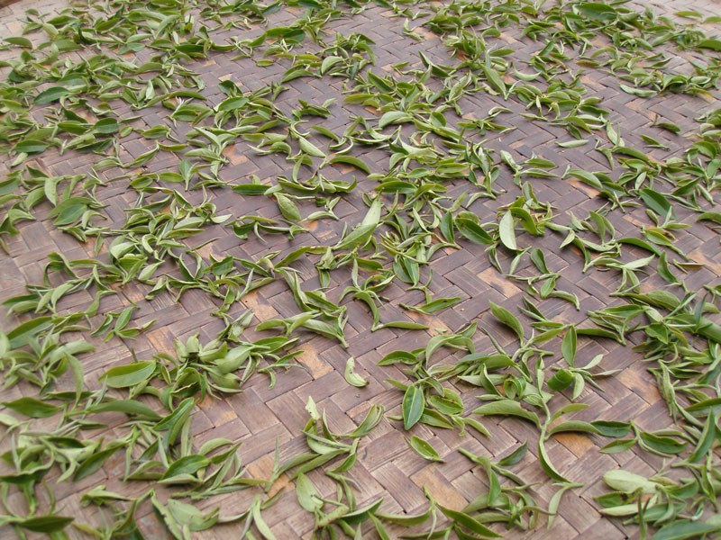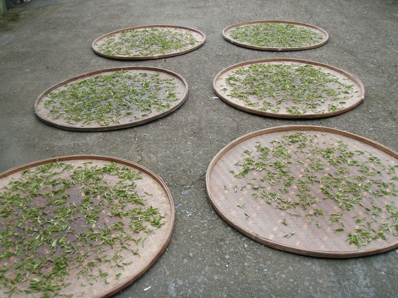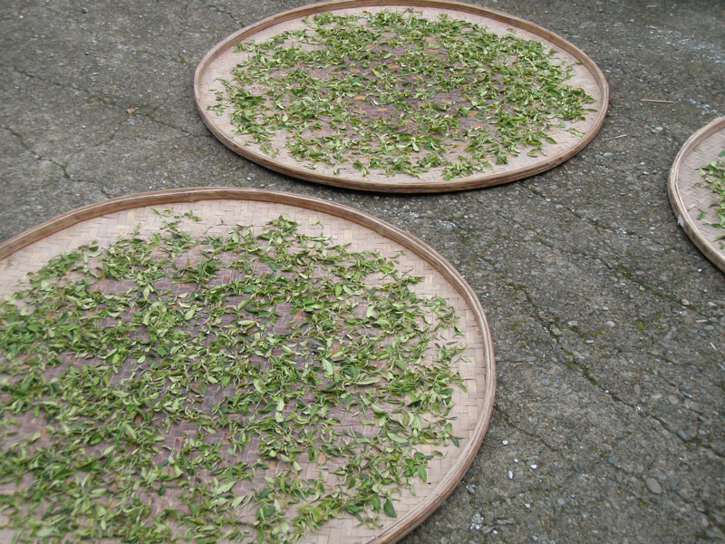 茶摘みが11時までなのには理由があります。文山東方美人茶を作るとき最も大切な作業日光萎凋を長時間行うためです。強い太陽の光をふんだんに浴びせ、じっくりと茶葉から水分を抜く作業です。民國100年ごろまでは直射日光、それ以降は寒冷紗下(半日陰)で夕方までじっくりと行います。萎凋時に茶葉が重ならないように薄く広げるのが特徴。
